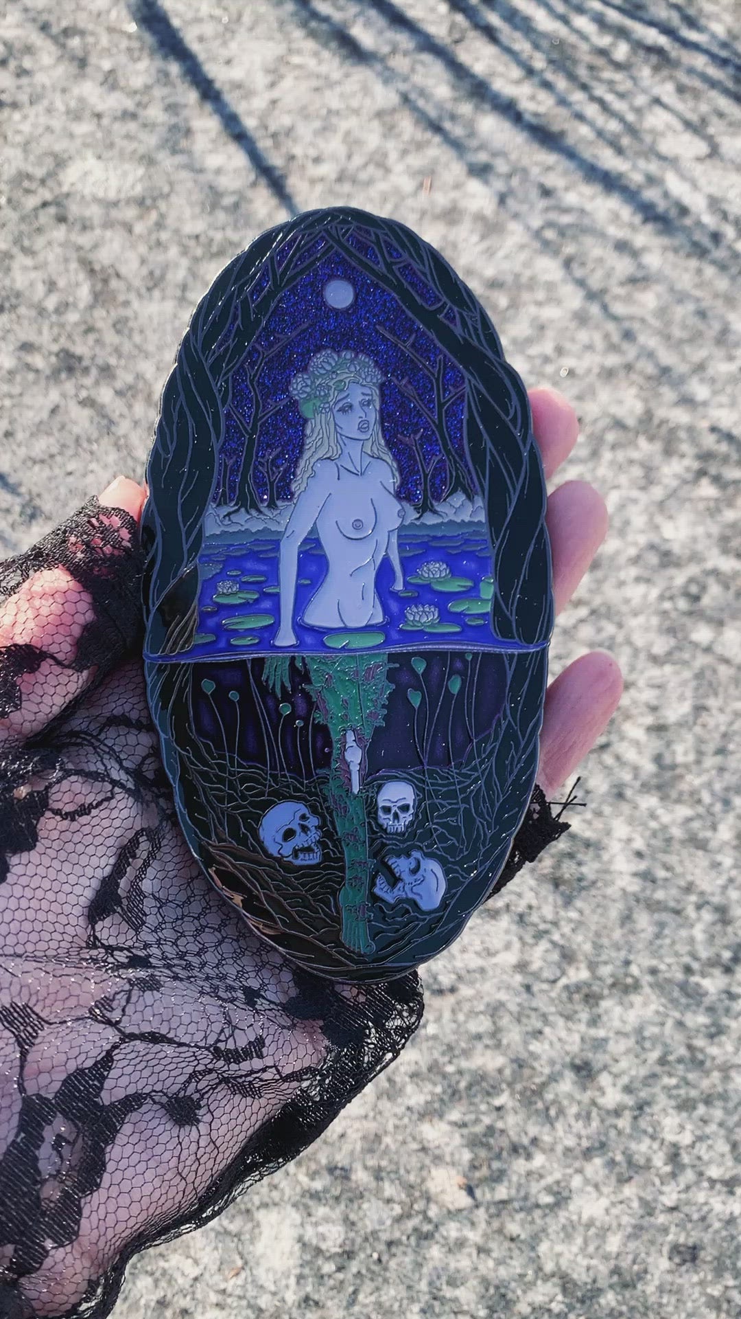 A monster of a pin at 5" tall, the Rusalka will command your attention and collection. The "Nocturne" edition features glitter, glow-in-the-dark, and pearlescent details to fascinate. Soft enamel + epoxy, limited edition of 99.